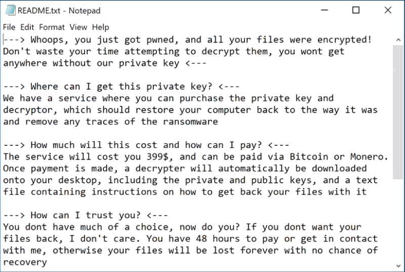 ---> Whoops, you just got pwned, and all your files were encrypted! Don't waste your time attempting to decrypt them, you wont get anywhere without our private key <--- ---> Where can I get this private key? <--- We have a service where you can purchase the private key and decryptor, which should restore your computer back to the way it was and remove any traces of the ransomware ---> How much will this cost and how can I pay? <--- The service will cost you 399$, and can be paid via Bitcoin or Monero. Once payment is made, a decrypter will automatically be downloaded onto your desktop, including the private and public keys, and a text file containing instructions on how to get back your files with it ---> How can I trust you? You dont have much of a choice, now do you? If you dont want your files back, I don't care. You have 48 hours to pay or get in contact with me, otherwise your files will be lost forever with no chance of recovery