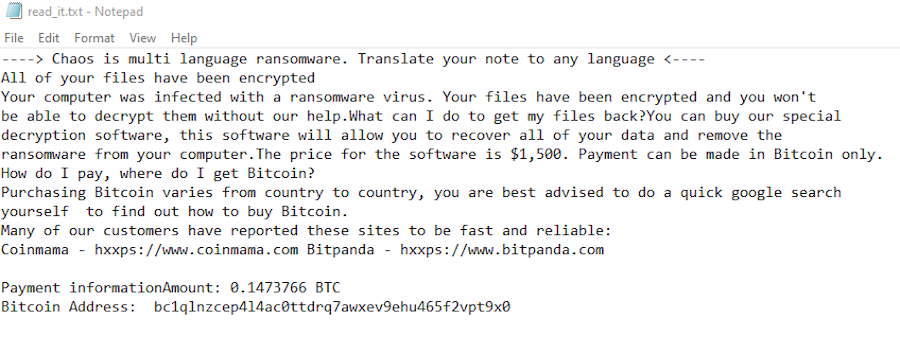 ----> Chaos is multi language ransomware. Translate your note to any language <---- All of your files have been encrypted Your computer was infected with a ransomware virus. Your files have been encrypted and you won't be able to decrypt them without our help.What can I do to get my files back?You can buy our special decryption software, this software will allow you to recover all of your data and remove the ransomware from your computer.The price for the software is $1,500. Payment can be made in Bitcoin only. How do I pay, where do I get Bitcoin? Purchasing Bitcoin varies from country to country, you are best advised to do a quick google search yourself to find out how to buy Bitcoin. Many of our customers have reported these sites to be fast and reliable: Coinmama - hxxps://www.coinmama.com Bitpanda - hxxps://www.bitpanda.com Payment informationAmount: 0.1473766 BTC Bitcoin Address: bc1qw0ll8p9m8uezhqhyd7z459ajrk722yn8c5j4fg In general, all Chaos versions say you can recover the data only by opting for special decryption software. The price for such software may vary depending on versions but can go up to 1,500$. The specified amount has to be paid in cryptocurrency (usually Bitcoin or Monero) to the attached wallet address. After this, cyber criminals promise that victims will obtain the necessary software to decrypt files and remove ransomware from their system. Usually, there are communication channels like e-mail attached by developers to maintain contact with them, however, this is not the case with many Chaos versions. This is why it is impossible to contact developers and negotiate in case something goes wrong. Some versions do not even have payment credentials, which means they are likely to be still under development. Whatever the case, it is advised against paying the ransom especially when there is such an ambiguity. Extortionists do not always keep their promise and fool desperate users by not sending any decryption tools. Luckily, there are some Chaos variants that can be approached by third-party decryption - to avoid paying the ransom. You just need to upload your sample to special decryption software and check if it can be unlocked. In case your files cannot be decrypted, the best and secure way to regain them is using backup copies stored on unplugged devices or cloud services. You can read the full information on ransomware removal as well as potential recovery options in our tutorial below.