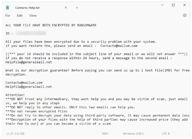 Find Contacto_Help.txt file and follow instructionsUnfortunately, no public decryption tools are available for Contacto as of now. Encryption used by such ransomware typically ensures that only the attackers can provide the key, which they claim to offer after receiving the ransom payment. It’s important to note, however, that paying the ransom does not guarantee file recovery, as cybercriminals may choose not to provide the decryption tool even after payment. For victims looking to decrypt .Contacto files, options are limited to restoring files from backups created before the infection, using professional data recovery services, or waiting for security experts to potentially develop a decryption solution in the future. In the meantime, maintaining up-to-date backups and employing robust security measures are vital to protecting against future ransomware attacks.