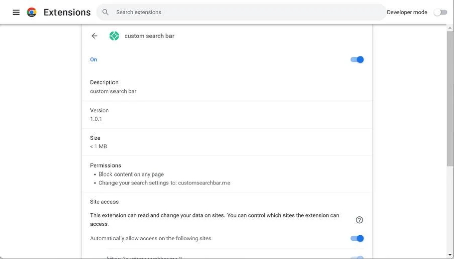 Note: Custom Search Bar can be installed as Google Chrome extension as Administrator (you may see Installed by enterprise policy inscription near it), and this will not allow removal. Therefore, before starting removal process, perform these actions: