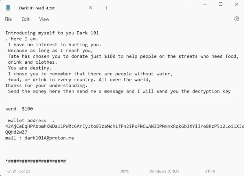 . This encryption method creates significant challenges for victims, as it utilizes robust cryptographic algorithms to block access to files until the decryption key is provided—allegedly after ransom payment. Upon completion of the encryption process, the ransomware delivers its ransom note through a text file named Dark101_read_it.txt, left on the infected computer’s desktop, and alters the desktop wallpaper with further instructions.
