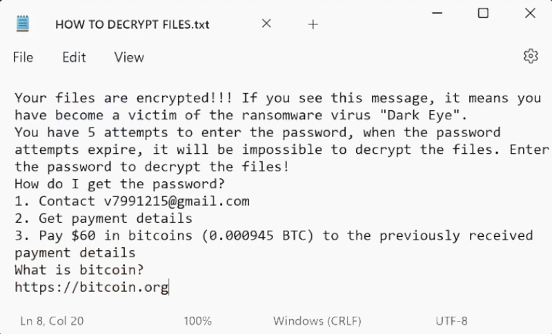 Dark Eye Ransomware is a malicious software belonging to the Xorist family, designed to encrypt files on an infected system and demand a ransom for their decryption. Upon infection, this ransomware appends the .darkeye extension to all encrypted files. For example, a file named 1.jpg