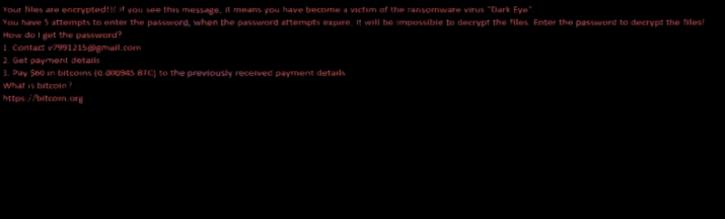 Your files are encrypted!!! If you see this message, it means you have become a victim of the ransomware virus "Dark Eye".
