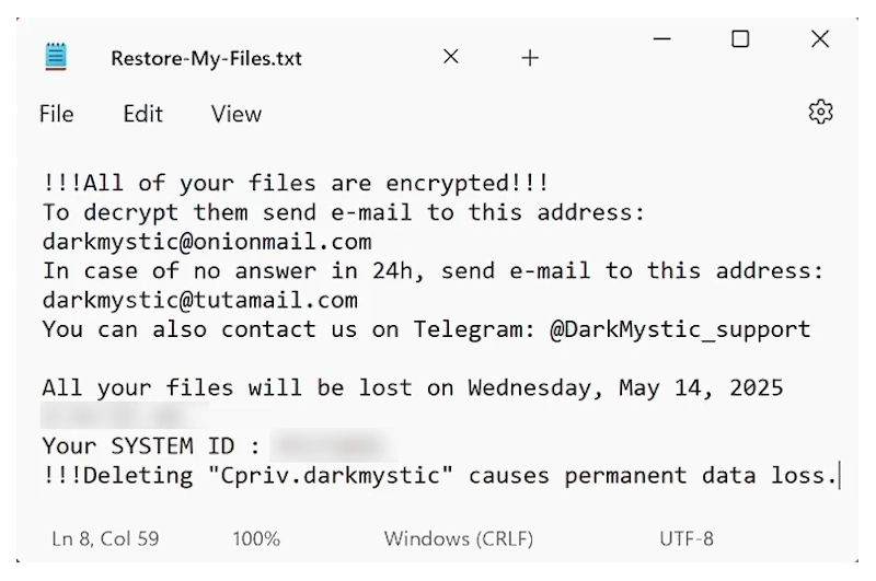 !!!Deleting "Cpriv.darkmystic" causes permanent data loss.Within these notes, victims are instructed to contact the cybercriminals via specified emails or Telegram to negotiate the decryption of their locked files. Despite claiming to provide a decryptor upon payment, attackers often fail to deliver as promised, and paying seldom results in file recovery. Unfortunately, as of now, no decryption tools exist publicly available that can decrypt files affected by this sophisticated ransomware. Thus, the best recovery method remains restoring from a clean, disconnected backup. Given the complexities surrounding the decryption of data encrypted with DarkMystic (BlackBit) Ransomware, it is crucial for users to regularly back up data in multiple secure and isolated locations, utilize reputable security software, and practice caution with unsolicited emails and downloads to mitigate the risks posed by such ransomware threats.