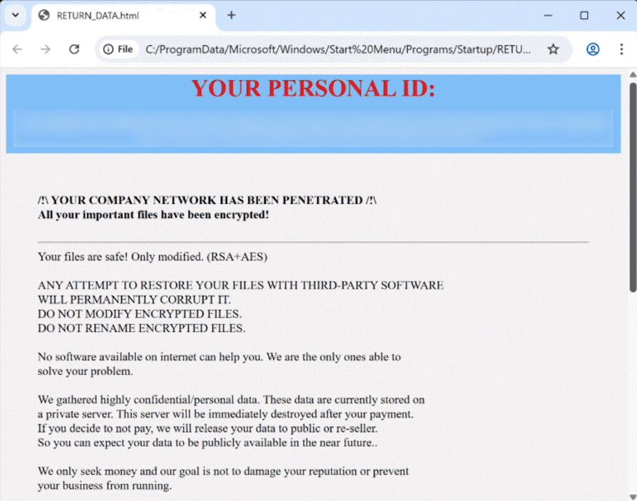 , clearly signaling to users that their data is under hostage. To further its intimidation, the malware alters the desktop wallpaper and drops a ransom note – RETURN_DATA.html – directly onto the desktop and within folders containing encrypted content, ensuring the victim’s awareness is immediate and persistent. This HTML ransom note sternly warns against using third-party recovery tools, renaming encrypted files, or modifying them, as these actions may result in irreversible data corruption. Compounding the pressure, the criminals claim to have exfiltrated sensitive data and threaten to leak or sell this information unless contact is made and payment arranged within a strict time frame. Contact details, typically anonymous email accounts, are provided for negotiations, where victims are encouraged to send samples for “free decryption” as proof of capability. Datarip’s communication tactics underscore the dual risk of permanent data loss and potential privacy breaches.