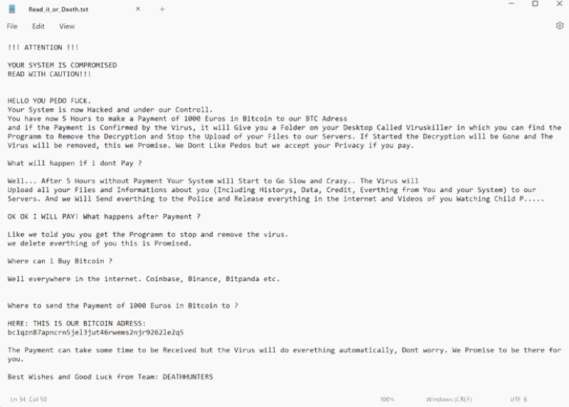. This malware then alters the user’s desktop wallpaper to display a harrowing message that falsely accuses the user of pedophilia, attempting to pressure victims into paying a ransom. It also creates a file titled Read_it_or_Death.txt, which serves as the ransom note. This note demands a payment of 1,000 euros in Bitcoin to provide a decryption tool, warning that failure to comply will result in compromising personal information being leaked online and to the authorities.