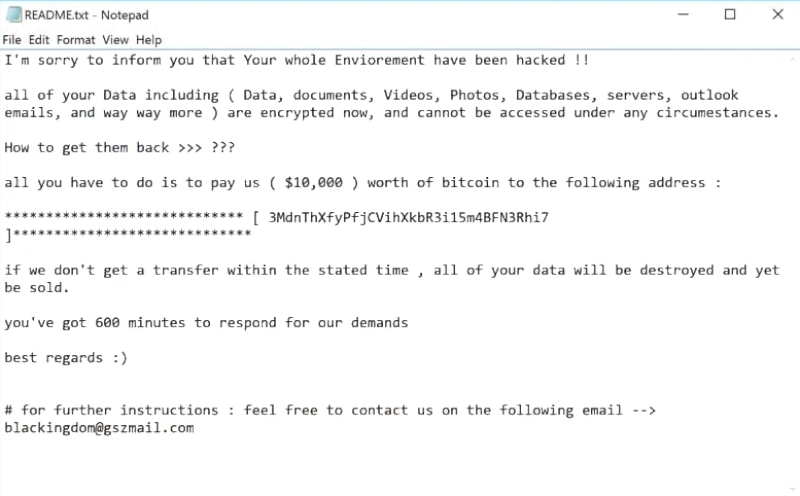 , clearly marking the files as compromised. After encryption, the ransomware creates a README.txt file in all directories containing encrypted files and displays a ransom note in a pop-up window, demanding a hefty $10,000 in Bitcoins to decrypt the affected files. According to the ransom note, victims have a narrow window of 600 minutes (10 hours) to comply, or their data will be destroyed or sold to third parties.