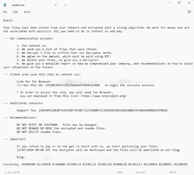 12/07/2024 00:00 UTC the decryptor will be destroyed and the files will be published on our blog.