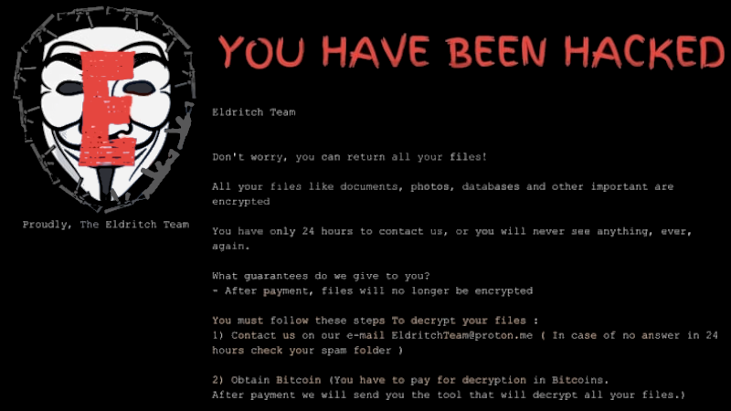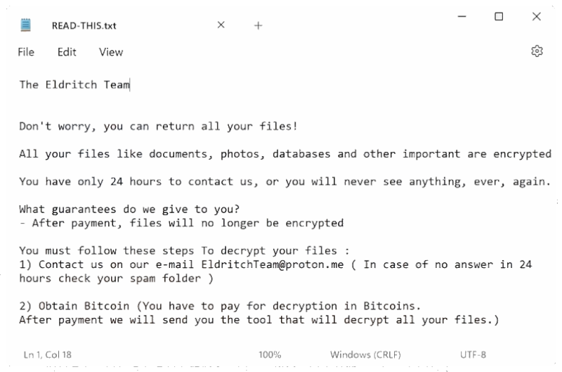 Eldritch Ransomware is a type of malware that encrypts important personal files on the victim’s computer, making them inaccessible until a ransom is paid to the attackers. It adds the .eldritch file extension to the encrypted files. Eldritch Ransomware likely uses a combination of symmetric and asymmetric encryption algorithms, similar to other modern ransomware strains. Symmetric encryption algorithms, such as AES, can be used to encrypt files quickly, while asymmetric encryption algorithms, like RSA, are used to encrypt the symmetric keys. Eldritch Ransomware creates a ransom note in a text file named READ-THIS.txt. The note typically informs the victim that their files have been encrypted and demands a ransom payment in exchange for a decryption key. The cybercriminals behind Eldritch Ransomware can be contacted at EldritchTeam@proton.me.