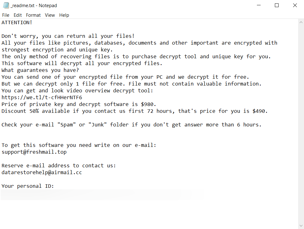 Eqew Ransomware is a malicious software that belongs to the Djvu/STOP family. Its primary purpose is to encrypt files on the victim’s computer and demand a ransom for their decryption. The ransomware appends the .eqew extension to filenames, making them inaccessible without a unique decryption key. Once installed, Eqew ransomware establishes a connection with its command and control server, controlled by the attackers. It then encrypts files using a strong encryption algorithm and a unique key, either an ‘offline key’ or an ‘online key’. After the encryption process, Eqew ransomware creates a ransom note named _readme.txt in every folder containing encrypted files. The ransom note states that files have been encrypted and can only be decrypted by purchasing a decryption tool and a unique key. The cost of acquiring the private key and decryption software is $980, but there is a 50% discount if victims contact the attackers within the first 72 hours, lowering the price to $490. Victims can communicate with the cybercriminals via the provided email addresses: support@freshmail.top