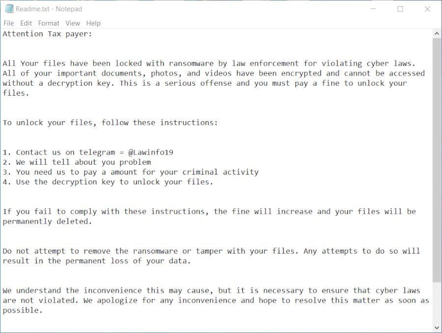 All Your files have been locked with ransomware by law enforcement for violating cyber laws. All of your important documents, photos, and videos have been encrypted and cannot be accessed without a decryption key. This is a serious offense and you must pay a fine to unlock your files.