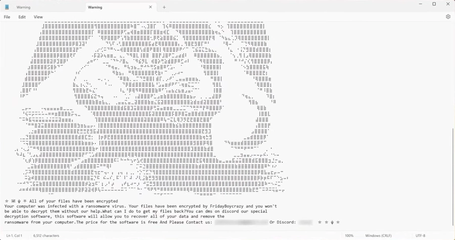 FridayBoycrazy Ransomware is a significant threat that has emerged recently, designed to encrypt files on infected systems and extort ransom payments from victims. This variant, based on the Chaos ransomware, exhibits a severe level of damage by actively encrypting various file types and making them inaccessible without a decryption key. Once this malicious software is executed, it meticulously renames encrypted files by appending a string of random characters to their original extensions. For example, a file named 1.jpg may be altered to 1.jpg.j3y4, making recovery efforts more challenging for victims. Upon completion of the encryption process, it generates a ransom note named Warning.txt, which is typically placed on the desktop and informs users that their files have been compromised. The perpetrators claim that decryption without their assistance is impossible, thereby fueling fear and urgency in their victims to pay the ransom.