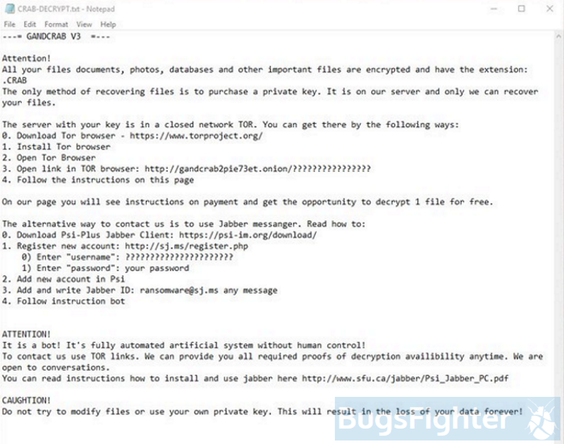 GandCrab V3 Ransomware is another generation of high-risk GandCrab virus, that uses AES-256 (CBC-mode) + RSA-2048 encryption algorithms. This version also appends .CRAB extensions to all encrypted files. GandCrab V3 creates similar CRAB-DECRYPT.txt file with changed ransom note. Here is updated content from this file: