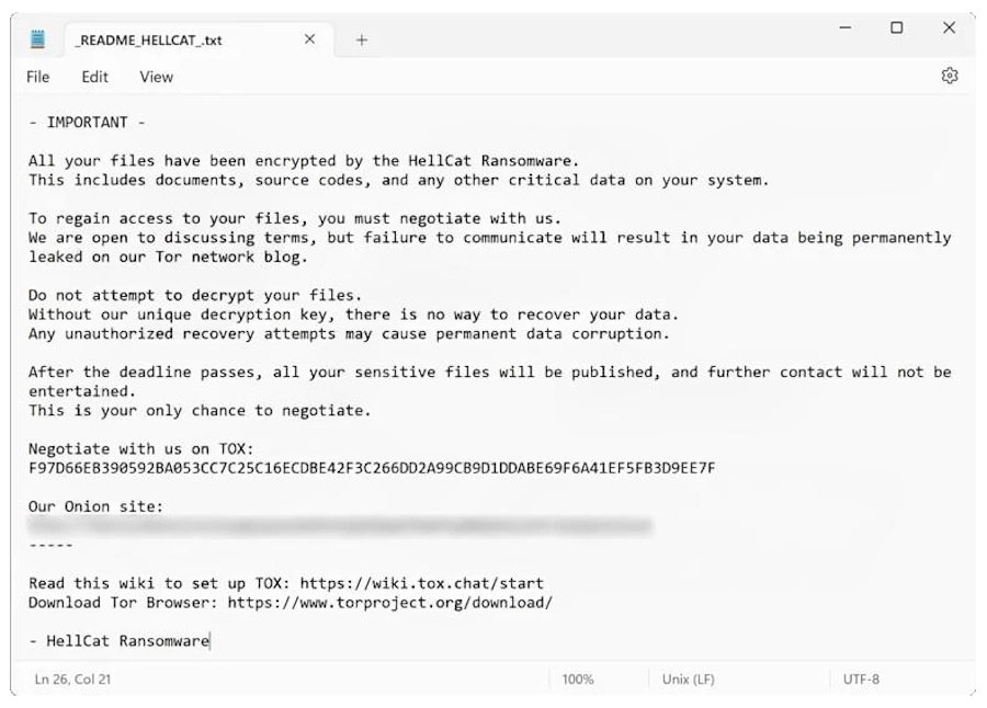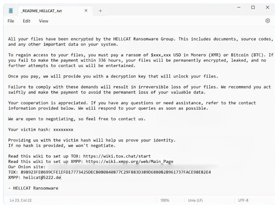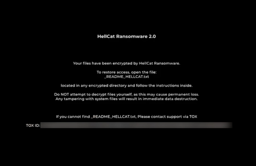 HellCat Ransomware, a potent cyber threat, stealthily infiltrates systems, rendering victims’ files inaccessible by encrypting them and appending the .HC extension. It operates by utilizing advanced encryption algorithms, making unauthorized decryption efforts nearly impossible without the attacker’s decryption key. Victims typically find their desktop wallpaper altered, a stark indicator of the breach, and a ransom note dropped in each folder where files are encrypted. This note, usually titled _README_HELLCAT_.txt, contains demands and instructions for contacting the attackers, often highlighting a deadline for payment to prevent data leaks or permanent encryption. The note is designed to create urgency, with threats of repercussions if any attempts to decrypt the files without authorization are made.