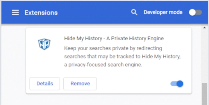 Note: Hide My History can be installed as Google Chrome extension as Administrator (you may see Installed by enterprise policy or Your browser is managed by your organization inscription near it), and this will not allow removal. Therefore, before starting removal process, perform these actions: