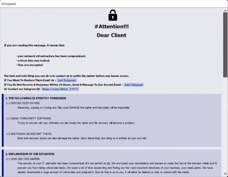Hitler_77777 Ransomware infects computers primarily through deceptive tactics, often involving phishing emails that contain malicious attachments or links. These emails are crafted to appear legitimate, persuading users to open them, which then initiates the malware download. Additionally, the ransomware can spread through compromised websites that host drive-by download attacks, or through pirated software and illegal cracking tools that users inadvertently download. Malicious ads, known as malvertisements, also play a role by redirecting unsuspecting users to sites that automatically install the ransomware. Once inside a system, Hitler_77777 not only encrypts files but also attempts to spread across networks, targeting additional devices and connected storage, thereby increasing its impact. Users are often unaware of the infection until a ransom note appears, demanding payment for file decryption.