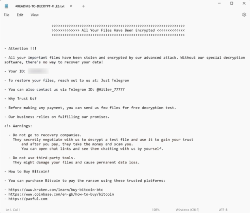 for more information see #README-TO-DECRYPT-FILES.TXT that is located in every encrypted folderWith regards to decryption tools, currently, there are no publicly available decryptors for Hitler_77777 Ransomware. The encryption methods this ransomware employs are robust, often using unique keys generated during the attack, making unauthorized decryption nearly impossible. Consequently, victims face a challenging dilemma: paying the demanded ransom to potentially recover their files or relying on backups if available. For decrypting files with the extension .[ID-random].[Telegram ID @Hitler_77777].XSHC, the only known method involves acquiring the decryption key from the cybercriminals, which inherently carries the risk of not actually receiving a working key even after payment. As a preventative approach, updating security measures and maintaining regular data backups are crucial steps to protect against such incidents, helping to bypass reliance on unpredictable and potentially exploitative actors.