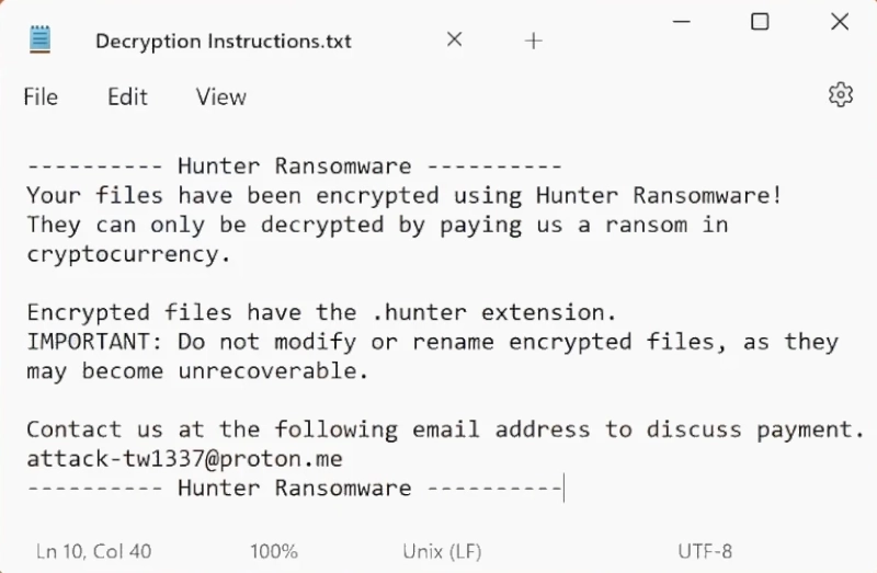 ---------- Hunter Ransomware ----------Despite the dire situation, there currently are no publicly available decryption tools to help victims restore their files encrypted by this ransomware without paying the ransom. Consequently, data recovery through traditional means is highly unlikely, and assistance from cybercriminals is never guaranteed, making the payment option a risk-laden strategy. To decrypt .Hunter files, the best hope for victims is the discovery of vulnerabilities within the ransomware’s encryption process, allowing cybersecurity researchers to develop a decryption tool. In the meantime, maintaining comprehensive data backups and utilizing robust security practices is highly advisable to mitigate future risks. Victims should also disconnect the infected device from the internet and remove the ransomware from their systems using reputable antivirus software to prevent further encryption. Sharing the attack details with authorities and security researchers may help in both tracking the perpetrators and potentially accelerating the discovery of a decryption solution.