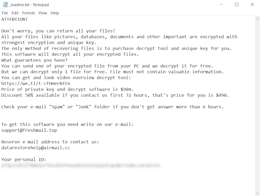 Iicc Ransomware is a variant of the notorious STOP/DJVU ransomware family. It is a file-encrypting ransomware infection that restricts access to data such as documents, images, and videos by encrypting files and appending the .iicc extension to them. The ransomware then attempts to extort money from victims by asking for a ransom, typically in the form of Bitcoin cryptocurrency, in exchange for access to the encrypted data. Once the Iicc Ransomware infects a computer, it scans for images, videos, and important productivity documents and files such as .doc, .docx, .xls, .pdf. When these files are detected, the ransomware encrypts them using the Salsa20 encryption algorithm. After the encryption process, the ransomware drops a ransom note named _readme.txt on the desktop. The ransom note contains instructions on how to contact the authors of this ransomware via the support@freshmail.top and datarestorehelp@airmail.cc email addresses. The ransom demanded ranges from $490 to $980 in Bitcoins.