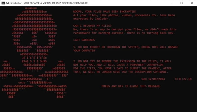PRESS ANY KEY TO CLOSE THIS MESSAGEUnfortunately, as of now, there are no known decryption tools available for files affected by Imploder Ransomware. The encryption algorithms employed by Imploder are likely very advanced, making it nearly impossible to decrypt files without the original key, which only the attackers possess. Therefore, restoring access to these files without meeting the ransom demands is currently infeasible. Victims are advised against paying the ransom, as this not only emboldens the cybercriminals but often does not guarantee the return of their files. The optimal strategy post-infection is to remove the ransomware entirely from the operating system to prevent further file encryption. For now, recovery of encrypted files is only possible through backup solutions, provided such backups were made prior to the ransomware’s attack and stored in safe, disconnected locations. Regular backups and maintaining updated security software remain the best preventative measures against such incursions.