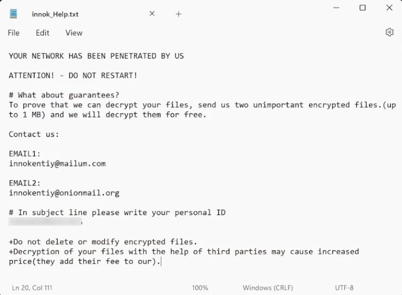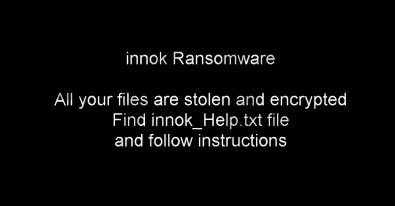 after encryption, making it unusable without a decryption key. The ransomware typically employs robust encryption algorithms, often making use of either symmetric or asymmetric cryptography to lock the data securely and prevent victims from accessing their files without the decryption software or key. Upon completion of the encryption process, the ransomware alters the desktop wallpaper, replacing it with a ransom note titled innok_Help.txt, which explains the encryption situation and demands a ransom for decrypting the files. This note can be found on the desktop and is also shown on an overlay screen that appears before user account sign-in.