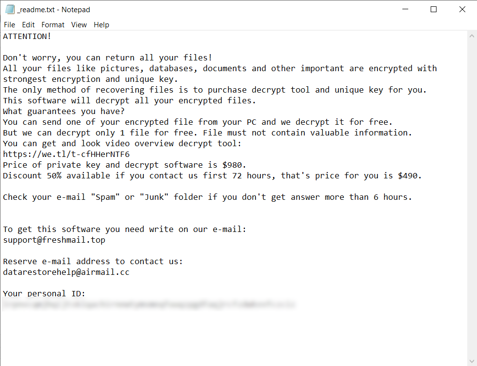 Jzeq is a ransomware variant belonging to the Djvu family. It is a type of malicious software that encrypts files on a victim’s computer, rendering them inaccessible. The ransomware appends a .jzeq extension to the filenames of the encrypted files, effectively blocking access to them. Once Jzeq ransomware infects a device, it conducts a scan of the files and proceeds to encrypt any documents, photos, archives, databases, PDFs, and other types of files that it finds. This renders the victim’s files inaccessible and makes it difficult to recover them without the help of the attackers. The ransomware creates a text file named _readme.txt on the infected device, which contains instructions from the operators of the Jzeq Ransomware. The note emphasizes the urgency of reaching out to them within 72 hours to avoid an increased ransom fee. If the victim refuses to contact the attackers within this timeframe, the ransom amount for the decryption software and key will rise from $490 to $980.