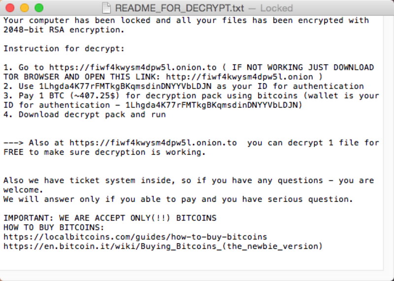 https://en.bitcoin.it/wiki/Buying_Bitcoins_(the_newbie_version)Unfortunately, laboratories have not identified the appropriate measure to decrypt the inflicted data. Instead, victims offer a paid solution which is buying a decryption program. The transaction has to be made via the Tor browser by paying 1 BTC (around 407 at that time), now Bitcoin accounts for roughly $5,260. Extortionists also claim that they will answer any of your questions if you are really motivated to pay a ransom. You can also decrypt 1 file via the Tor page linked in the note. As mentioned, third-parties tools are currently unable to decipher the locked data. But you can certainly delete KeRanger Ransomware from your Mac and remove quarantine folders/files. We will show how to do this below.