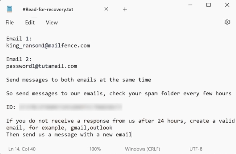 . This ransomware uses sophisticated encryption algorithms, making file recovery challenging without specific decryption keys. An ominous ransom note named #Read-for-recovery.txt is created on the infected system and also changes the desktop wallpaper to instruct victims on how to reclaim their files. The note directs victims to contact the cybercriminals through the provided email addresses and await further instructions.
