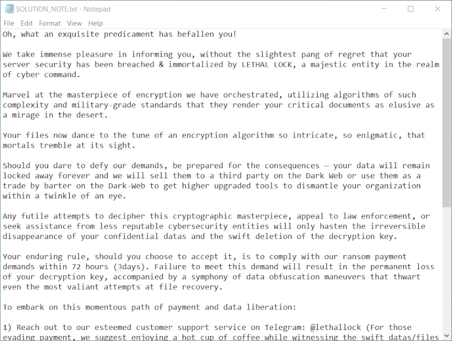 after encryption. This extension serves as an indicator that the file has been compromised by the ransomware. Lethal Lock employs complex, military-grade encryption algorithms to secure the victim’s files. The specific encryption methods are not detailed in the available sources, but the ransomware claims to use highly sophisticated cryptographic techniques that make decryption without the key virtually impossible. The ransom note generated by Lethal Lock is named “SOLUTION_NOTE.txt” and is typically placed in directories containing encrypted files. The note begins with a taunting message, acknowledging the breach and describing the encryption as nearly unbreakable without the decryption key. It demands a ransom payment of 25 bitcoins within 72 hours, threatening permanent data loss and the sale of data on the dark web if the demands are not met. The note also provides instructions for contacting the attackers via Telegram (@lethallock) to arrange the payment.