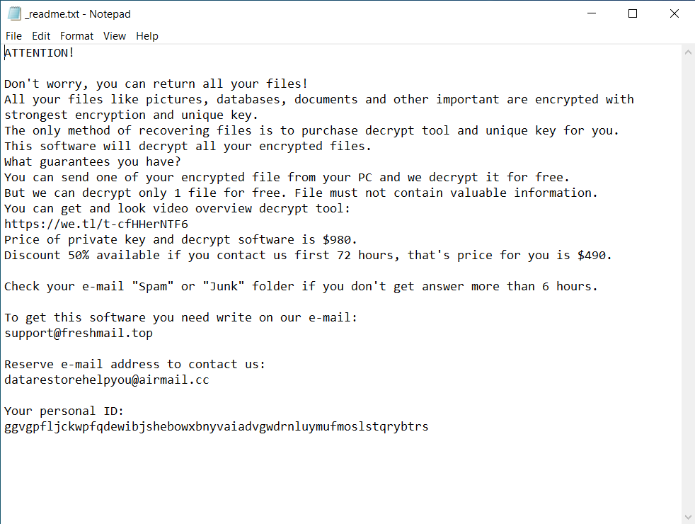 Lkfr Ransomware is a variant of the STOP/DJVU ransomware family, known for its malicious file encryption operations. Once it infiltrates a system, it targets various file types, encrypting them and appending the .lkfr extension, rendering them inaccessible without a decryption key. The ransomware demands a ransom payment in Bitcoin, typically ranging from $499 to $999, in exchange for the decryption key. After encryption, LKFR ransomware displays a ransom note named _readme.txt with payment instructions, demanding payment in Bitcoin to provide a decryption key. The note typically includes contact information and a unique ID for the victim. Lkfr Ransomware represents a significant threat due to its robust encryption tactics. Victims should focus on prevention, use reputable security solutions, and maintain regular offline backups to mitigate the impact of such ransomware attacks. If infected, it is crucial to remove the ransomware from the system and explore all available options for file recovery without succumbing to ransom demands.
