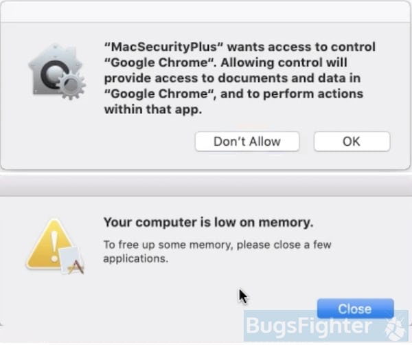 "MacSecurityPlus" wants access to control "Google Chrome". Allowing control will provide access to documents and data in "Google Chrome", and to perform actions within that app.