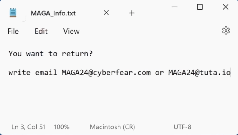 write email MAGA24@cyberfear.com or MAGA24@tuta.ioUnfortunately, there are currently no free decryption tools available for files encrypted by MAGA ransomware. The encryption methods used by this ransomware are quite advanced, and recovery of encrypted files is not feasible without the decryption key held by the attackers. Victims are advised against paying the ransom, as it does not guarantee that the decryption keys will be provided by the criminals, which could result in further loss of data or financial resources. If affected by MAGA ransomware, the best course of action is to remove the ransomware using legitimate antivirus software to prevent further damage. For decryption of .MAGA files, the use of backups (if available) is encouraged, as restoring files from a secure backup is currently the most reliable way to regain access to the affected data. Regularly backing up important data and employing robust security measures can mitigate potential damage from such ransomware attacks.