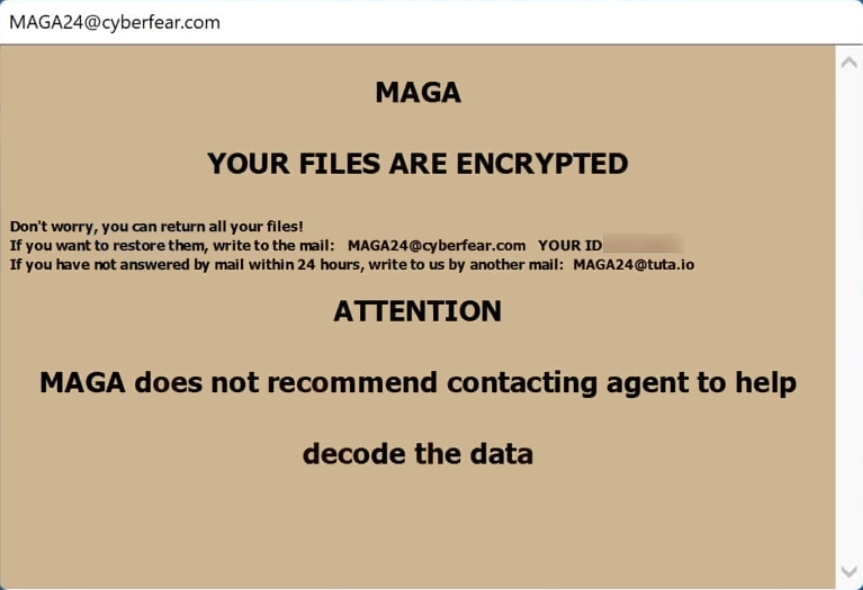 MAGA Ransomware is a type of malicious software that encrypts files on an infected computer and demands a ransom for their decryption. This ransomware is part of the Dharma family, known for appending a unique combination of identifiers to each file name to signify that they have been encrypted. Specifically, it adds an extension that includes the victim’s unique ID, an attacker’s email address, and the .MAGA file extension, transforming a file like document.docx into something like document.docx.id-J0CFK89P.[MAGA24@cyberfear.com].MAGA. For encryption, MAGA utilizes sophisticated algorithms that convert the files into an unreadable form, making it almost impossible to access them without a specific decryption key. The ransomware drops a ransom note within the infected system, typically as a pop-up message and as a text file named MAGA_info.txt, which instructs the victim to contact the attacker via email for file recovery instructions and warns against seeking third-party help.