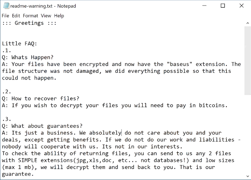 A: Your files have been encrypted and now have the "baseus" extension. The file structure was not damaged, we did everything possible so that this could not happen.