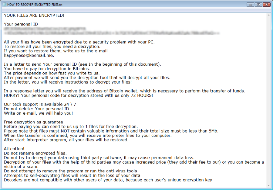 [redacted base64] All your files have been encrypted due to a security problem with your PC.
