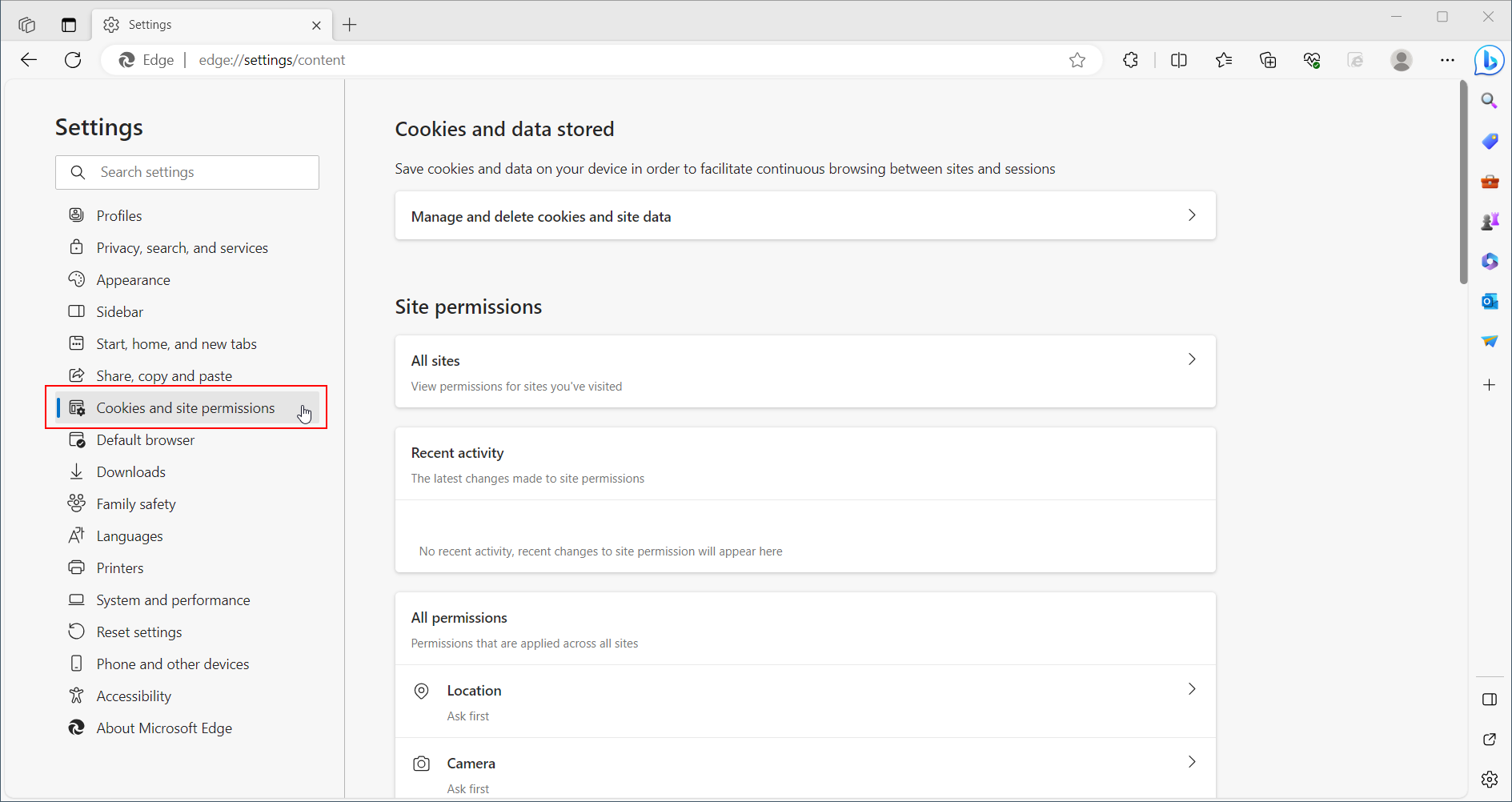 - In the menu click Cookies and site permissions section, and scroll down to All permissions section.
