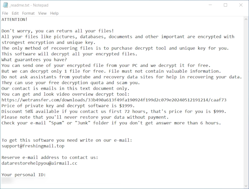 Miia Ransomware is a malicious software that belongs to the Djvu family of ransomware. It is designed to encrypt files on the victim’s computer, rendering them inaccessible and appending the extension .miia to each affected file. For example, a file named document.docx would be renamed to document.docx.miia after encryption. The encryption used by Miia Ransomware is highly sophisticated, typically involving AES-256 or RSA-2048 algorithms, making it virtually impossible to decrypt files without the unique decryption key held by the attackers. Once the files are encrypted, the ransomware generates a ransom note, _readme.txt, which is placed in every folder containing encrypted files. This note provides instructions for the victim on how to contact the cybercriminals and pay the ransom, usually demanding payment in Bitcoin.