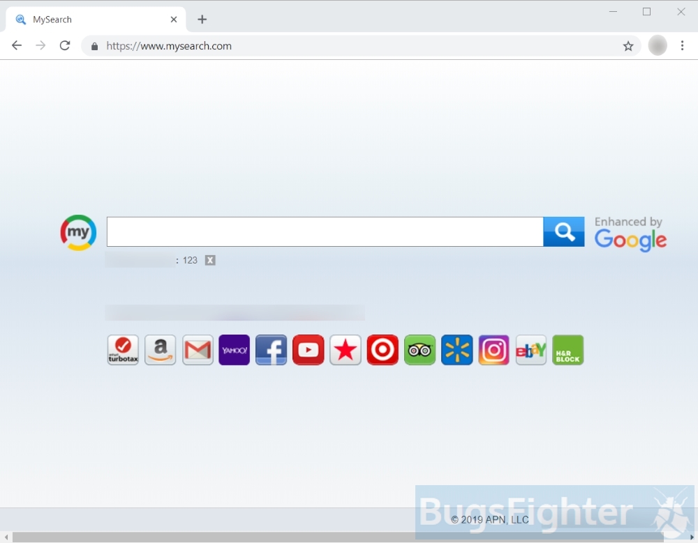 Mysearch.com by APN, LLC is dangerous browser hijacker for Google Chrome, Mozilla Firefox, Internet Explorer and Safari, that modifies settings of search engine and homepage. APN (Ask Partner Network) is related to a once-popular search engine Ask.com, that was distributed via unwanted toolbars installations. Mysearch.com looks like a legitimate search website with a search box, shortcuts with quick links to social networks and shopping sites and is said to be “enhanced by Google”. After closer research, it turns out, that users queries are redirected to search.mysearch.com, which is filled with third-party ads in search results and is quite different from Google SERPs. Developers earn on advertising inside this search engine, which is alright unless they started intrusive distribution and preventing users from reverting the changes back. Read the instructions below to remove Mysearch.com and reset browser settings.