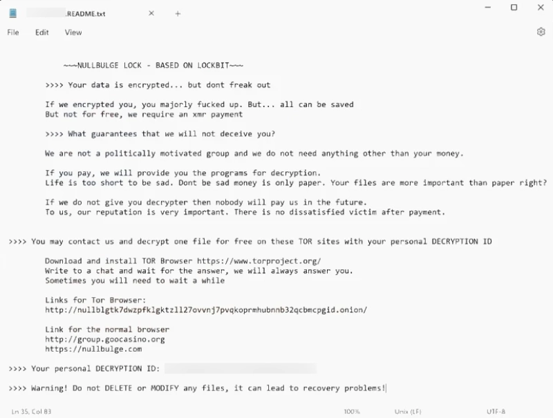 NullBulge Ransomware represents a formidable new threat in the ever-evolving landscape of cybercrime, specifically targeting AI and gaming communities. Originating from the notorious LockBit family, this ransomware variant not only encrypts files but also appends a unique, random extension such as .uhei662ns to the filenames. Victims might see their files transformed from document.docx to document.docx.uhei662ns, making them inaccessible without the decryption key. NullBulge ransomware is known to employ robust encryption algorithms, typically AES-256, which ensures that the files remain locked until the ransom is paid. Additionally, the ransomware modifies the victim’s desktop wallpaper to inform them of the breach and drops a ransom note, titled [extension].README.txt, in every affected directory. This note provides instructions on how to contact the cybercriminals, including links to TOR websites for secure communication and a personal decryption ID.