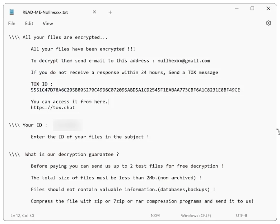 Nullhexxx Ransomware represents a concerning category of malware known for encrypting vital files on an infected computer and demanding a ransom for their release. Discovered through submissions on VirusTotal, this pesky ransomware appends the distinctive file extension .9ECFA84E to compromised files, effectively rendering them inaccessible without proper decryption. The process is underscored by a comprehensive encryption method that ties the victim’s files to a unique ID, ensuring individualized ransoms are crafted for every victim. Upon infiltration, victims are greeted with a replaced desktop wallpaper and the prominent ransom note, READ-ME-Nullhexxx.txt, strategically placed on the desktop and within each folder carrying encrypted files, serving as a stark reminder of the compromise. This note instructs victims to contact the cybercriminals through a specified email or the TOX messaging service to negotiate the terms of the ransom.