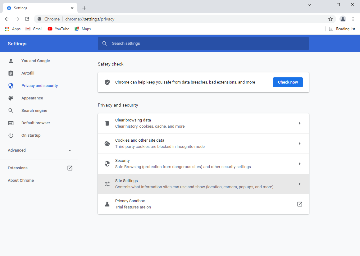 - Under opened Privacy and security tab, choose Site Settings.