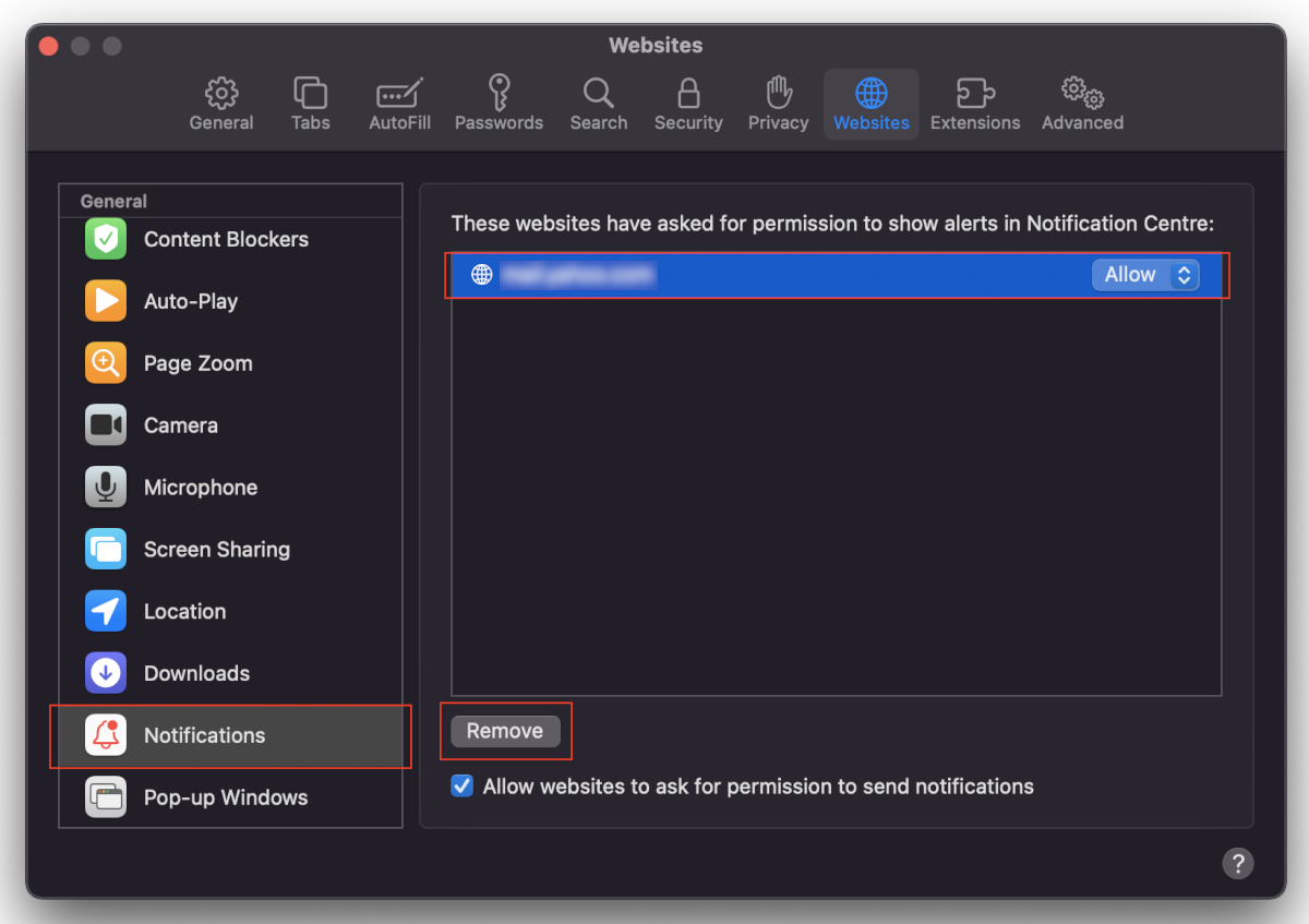 - Go to the bottom list of sites named Allowed to send notifications.