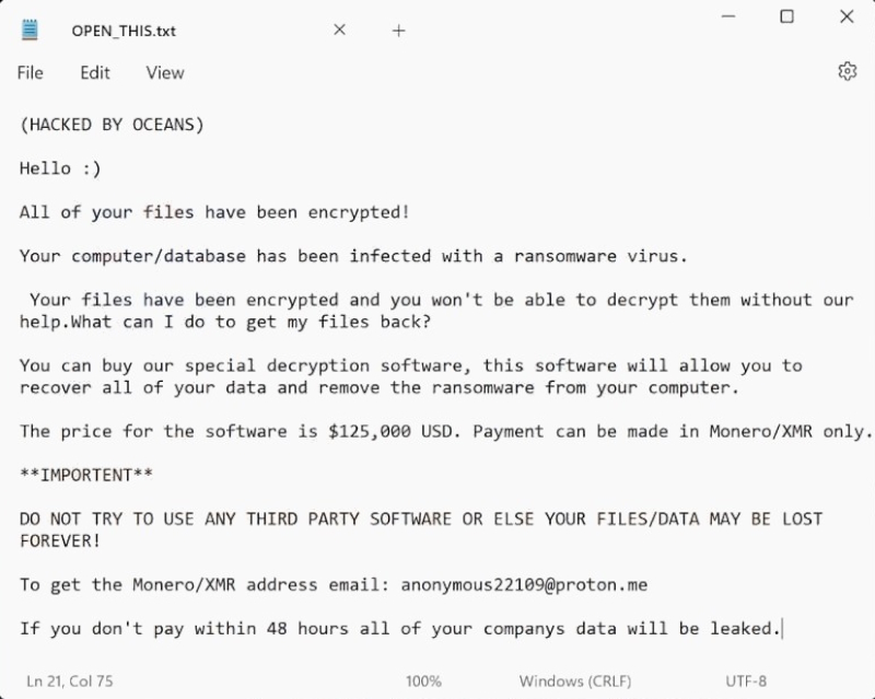 OCEANS Ransomware is a malicious software that encrypts files on the infected computer and then demands a ransom for their decryption. It is based on notorious Chaos Ransomware. Upon infection, it modifies the filenames of the encrypted files by appending four random characters to them. For example, a file named document.pdf might be renamed to document.pdf.xyiz after encryption by the OCEANS Ransomware. This use of randomly generated extensions for encrypted files is a common tactic among ransomware variants, making it more challenging for victims to identify and recover their files without the decryption key provided by the attackers. After infection malware creates ransom note OPEN_THIS.txt, where it informs that ransom amount is $124k. It also modifies desktop wallpaper.