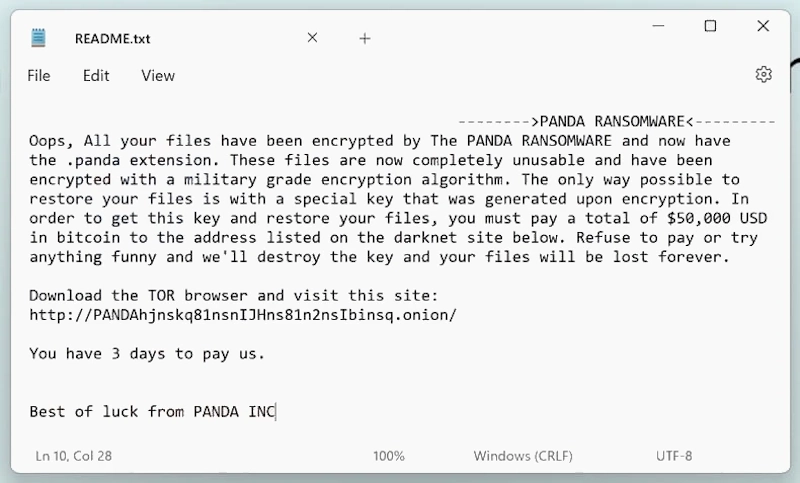 PANDA Ransomware represents a severe form of crypto-malware designed to encrypt victims’ files and demand exorbitant ransoms in exchange for decryption. Upon executing its malicious payload, this ransomware begins by targeting a wide array of file types and methodically encrypts them using robust cryptographic algorithms, often believed to be advanced AES or similar military-grade encryption. An unambiguous marker of this attack is the addition of the .panda file extension to every compromised file; an image like photo.jpg becomes photo.jpg.panda, signaling to the victim that their data is now inaccessible. Following full encryption, README.txt – a ransom note – appears throughout directories containing locked files and typically is also placed on the desktop. This note contains explicit instructions: pay $50,000 USD in Bitcoin within three days through a TOR-hosted payment portal or risk permanent data loss as the decryption key is allegedly destroyed after the deadline. Simultaneously, the desktop wallpaper is replaced with a visually alarming message urging the victim to consult the ransom note for details.