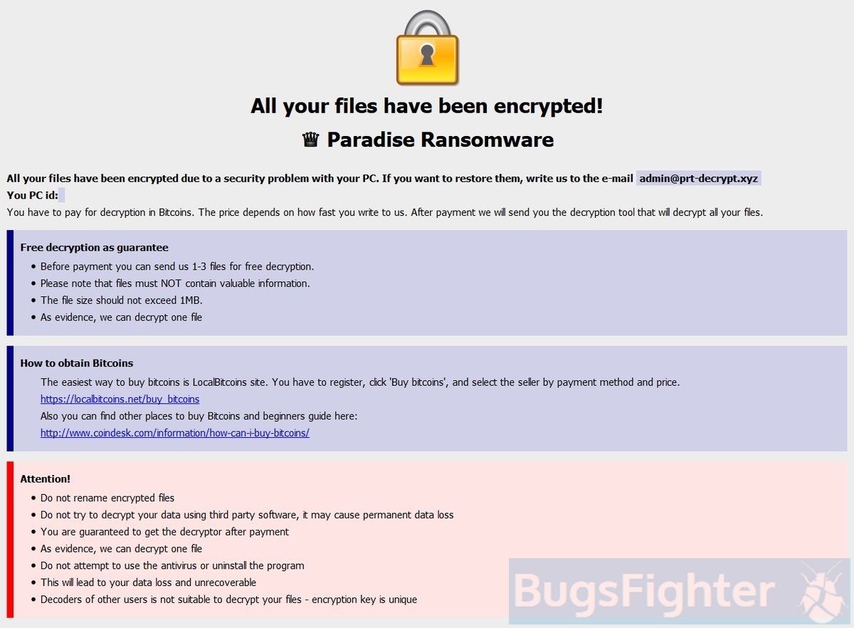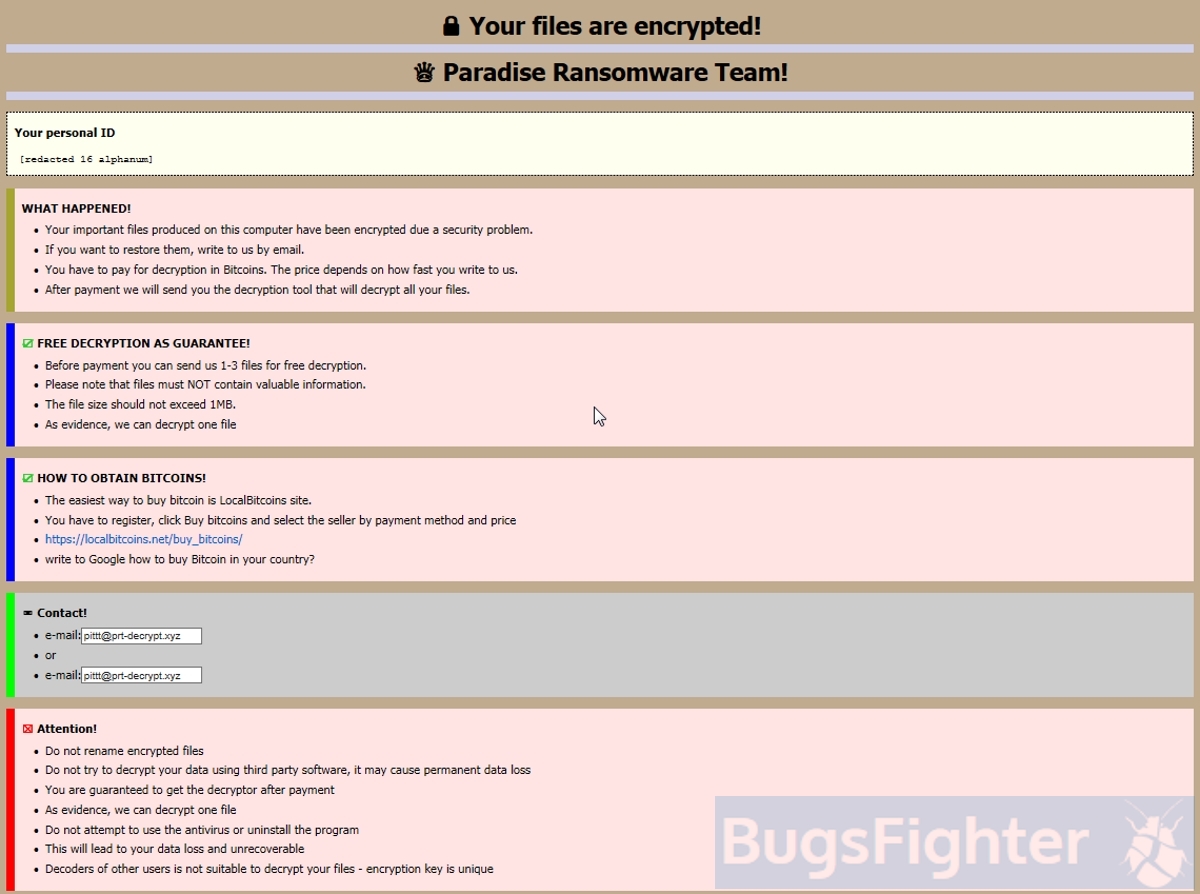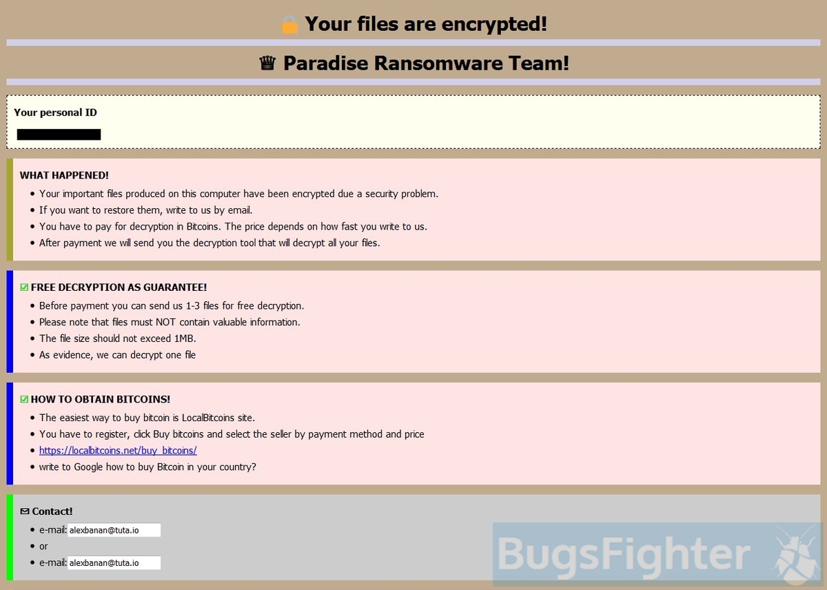 The malware leaves ransom note and contact information on the desktop and in the folders with affected files. Here are the contents of such files, that Paradise Ransomware shows to users.