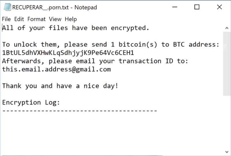 and reset its original icon. After this, the virus starts demanding the so-called ransom to recover your data. This information can be seen in a featured pop-up window or text note called RECUPERAR__.porn.txt.