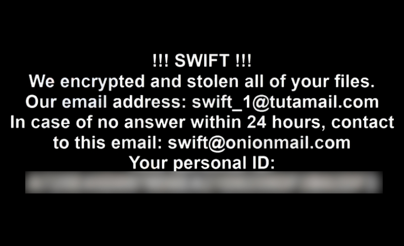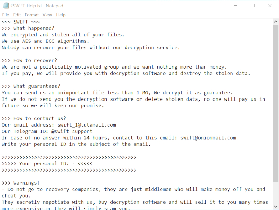 - Do not delete or modify encrypted files, it will lead to problems with decryption of files.~~~ SWIFT ~~~