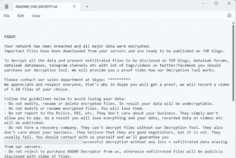 - Do not reject to purchase RADAR Decryptor from us, otherwise exfiltrated files will be publicly disclosed with video of files.