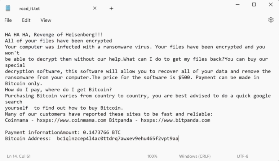 Bitcoin Address: bc1qlnzcep4l4ac0ttdrq7awxev9ehu465f2vpt9aaIn most cases with this type of ransomware, including the Revenge Of Heisenberg Ransomware, recovering your files without the attackers’ encryption key is exceptionally challenging. As of now, there are no publicly available decryption tools capable of cracking the encryption employed by this ransomware without paying the ransom. Moreover, paying the ransom does not guarantee data recovery since there is no assurance that the cybercriminals will provide the necessary decryption key. To protect your files and preserve critical data, regularly backing up data on external devices is highly recommended, ensuring that backups are stored safely offline or in a secured cloud environment. If already infected, it is best to focus on removing the malware from the system using reputable antivirus or malware removal tools to prevent further damage and data corruption.